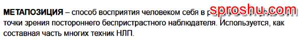 По поводу нлп и прочих техник не подскажу, так как не имею опыта и не особо хорошо к ним отношусь, но сама метапозиция это , по сути, тоже самое что и "над позиция", то есть когда человек способен уже не только пребывать в ситуации, а как бы наблюдать за собой и собеседником со стороны, рефлексировать, подмечать как он проявляется в той или иной ситуации, четче понимать , что именно не так, почему ситуация повторяется, но не субьективно, а именно подмечая все свои и сильные и слабые стороны, в основном для того, чтобы путем договоренностей и возможно смены своего привычного поведения максимально быстро достичь цели, понять собеседника и распределить роли или обязанности.