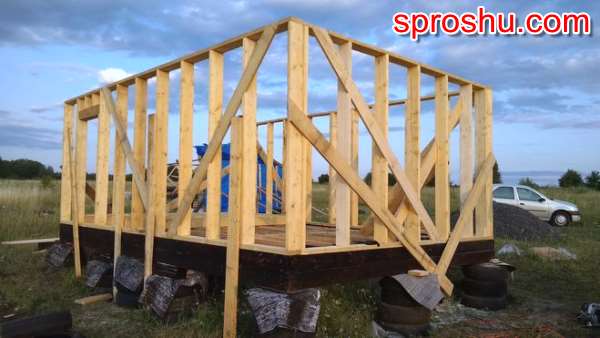 Лучше такого не делать, сначала надо построить не только стены вашей бани с черновым полом, но и фундамент, необязательно стены в полной отделке можно каркас временно просто "обшить" фанерой, шиферным листом и так-далее, а потом уже делать крышу и крыть её ондулином или еще чем. Дело в том, что фундамента, но с черновым полом, как у вас на рисунке и временных стен, но с крышей, сильный ветер может унести не только крышу, но и всю вашу недостроенную баню. Получается самолет- этажерка где четыре крыла в два яруса-пол и крыша. У моего знакомого из средней России (сам я живу на юге страны и бани у нас мало кто строит) так было, ветер разломал крышу и сдвинул недостроенную баню на два метра, повредив и каркас. Так что не спешите, как бывший прораб советую вам строить баню, начиная с фундамента, а заканчивать крышей и все будет о"кей.