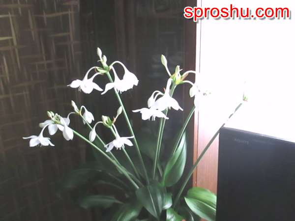 Эухарис, или амазонская лилия. При правильному уходе может цвести до 2-х раз в год. При уходе за эухарисом очень важен грамотный полив: растение не выносит перелива, даже малейшего, и если такое произойдет, то можно погубить растение (из своего опыта). Поливать амазонскую лилию нужно только тогда, когда почва после предыдущего полива полностью просохнет . Также эухарис очень теплолюбив, но прямые солнечные лучи также могут ему навредить. Эухарису очень важен период покоя (наступает после цветения). В отличие от гиппеаструмов и прочих луковичных, зеленые листья эухариса не отмирают в период покоя. На месяц после цветения его просто нужно убрать в более прохладное место и прекращается полив. Затем, месяц спустя, вновь возобновляется.