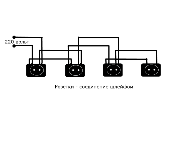 Ответ: шлейфом. Шлейфом запитывается одна розетка от другой.