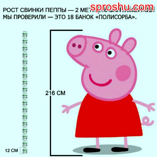 Вы будете очень удивлены, когда узнаете, что Свинка Пеппа очень большая девочка-хрюшка в прямом смысле этого слова. Ведь ее рост достигает 2,16 метра. Не знаю, как она достигла таких размеров, но эту цифру подтвердили исследователи и Гугл. Представляете, какой тогда рост у Папы и Мамы Свинки Пеппы?!