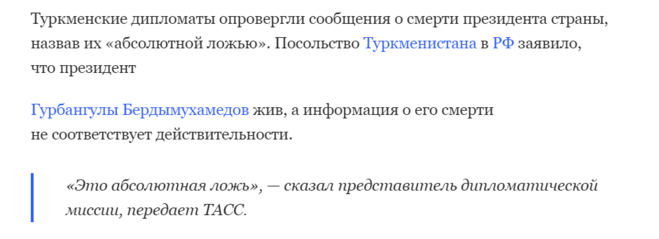 В посольстве Туркменистана, в Москве, опровергают смерть президента Гурбангулы Бердымухамедова и заявляют о том, что он жив и здоров.