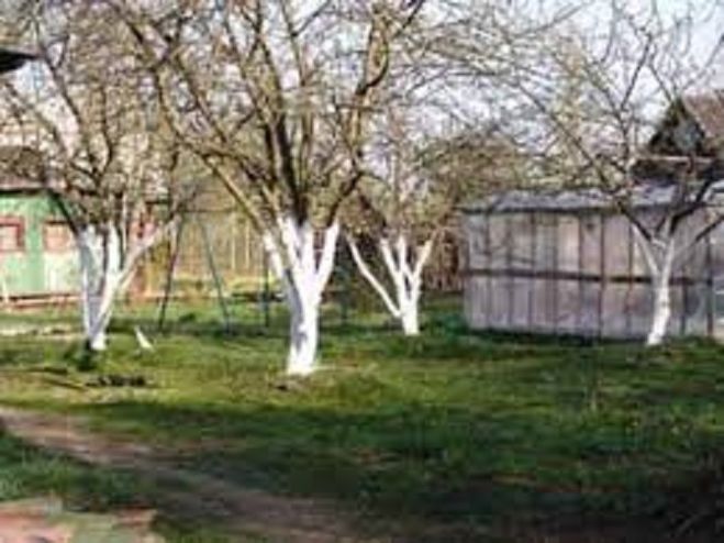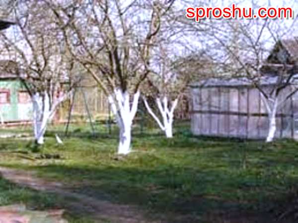Сосед по даче, известный своей мастеровитостью и обширными познаниями во всех областях, сказал, что деревья лучше всего белить на Пасху. Оно и не мудрено, скоро Благовещение - праздник пробуждения насекомых, и жаркие деньки. Ведь побелка нужна для защиты молодых деревьев от солнечных ожогов. Белить нужно до первых нижних веток, которые тоже надо побелить на 1/3.