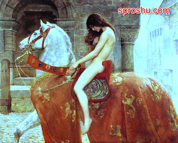 Эта целомудренная женщина испытывает чувство стыда, именно поэтому голова её опущена ниже уровня груди. Стыдно смотреть вперёд, ведь она - нога. Но цель, ради которой она приносит в жертву свою честь - благочестива, она спасает от непомерных налогов весь город Ковентри. Благороднейший поступок, благородной души. И жители города помогли своей леди, чем смогли - они затворились в своих домах, закрыв даже ставни, дабы не смущать леди Годива в её, может и безрассудном, но таком благородном споре с мужем-тираном. Она выиграла спор, а людям стало легче жить. Есть о чём задуматься, и есть с кого взять пример. Покойся с миром, благородная леди Годива! И, да помнят о тебе потомки!