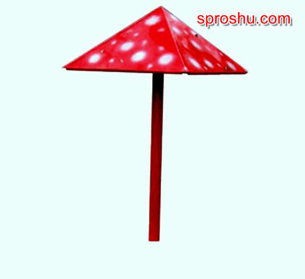 Не знаю, как в других странах, а в России эти "мухоморы" издавна украшают собой все детские площадки во дворах и детских садиках, даже у меня на приусадебном участке и то стоит один такой, правда, выкрашен он не под ядовитый мухомор, а в жизнерадостный жёлтый цвет. Называется это сооружение "грибок", причём "грибок" бывает не только детским, но ещё и караульным. Кстати, только что пришла в голову одна забавная мысль - расставляя такие грибки под всем детским площадкам, проклятые коммунисты с малолетства готовили из детей часовых и охранников лагерей. Предлагаю российским либералам взять эту мысль на вооружение:)). А ответ на вопрос такой - грибок.