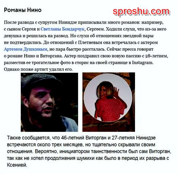 Нино Нинидзе- горячая 27-летняя грузинская женщина вполне способна растопить печаль Виторгана о прошлом скоропалительно разбившемся браке. А когда Нинидзе узнала об этих слухах и обсуждениях, она напомнила, что она свободная женщина после расставания с актером Кириллом Плетневым.