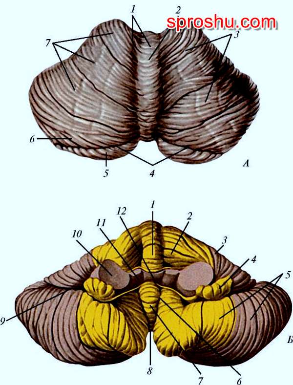У различных живых существ мозжечок различается и по форме, и по размерам. У человека он расположен в задней черепной ямке. Состоит из двух полушарий, которые посредине соединены при помощи структуры, называемой "червь".