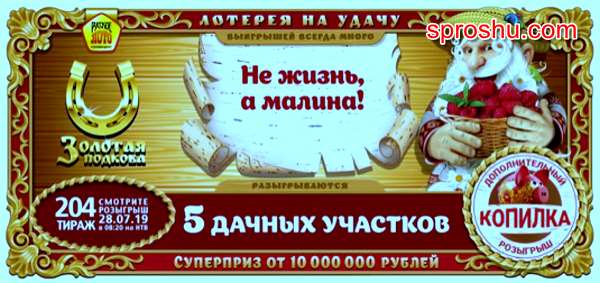 Лотерея Золотая подкова продолжать летний розыгрыш дачных участков. Эта информация есть на лотерейном билете 204 тиража, который разыграют 28 июля 2019 года. Канал НТВ показывает розыгрыш в утреннем воскресном эфире с 8 часов 20 минут. У многих может начаться "Не жизнь, а малина!" написано по центральной части лотерейного билета, а домовенок в соломенной шляпе держит корзинку со свежей малиной.