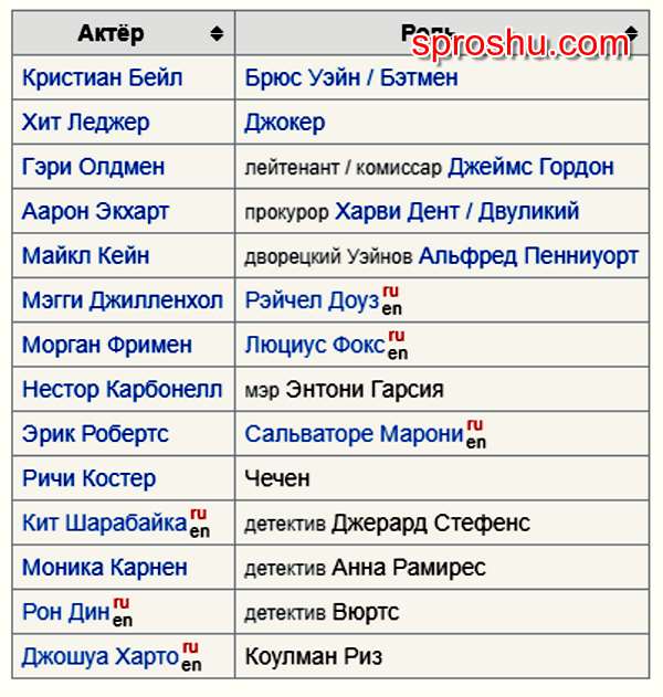 Во собственно полный список артистов и артисток снимавшихся в замечательном кинофильме "Бэтмен черный рыцарь".