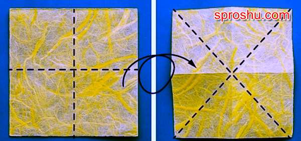 Теперь складываем треугольник, пользуясь сделанными сгибами, после чего отгибаем уголки по пунктирным линиям: