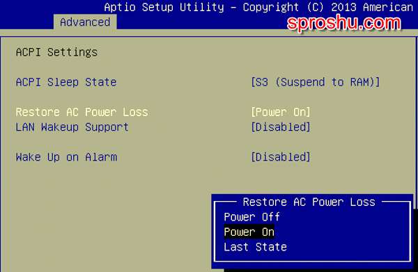 Поведение системного блока при подаче питания можно настроить в BIOS. Как правило, в разделе Advanced есть один из следующих параметров: