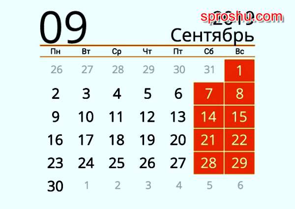 Для ответа просто возьмем календарь на сентябрь 2019-го года и посмотрим, есть ли в этом месяце государственные праздники, в которые устанавливаются выходные дни. И окажется, что сентябрь в плане праздничных дней абсолютно "спокоен" - нет ни одного праздничного выходного дня. Остаются только обычные выходные в субботы и воскресенья.