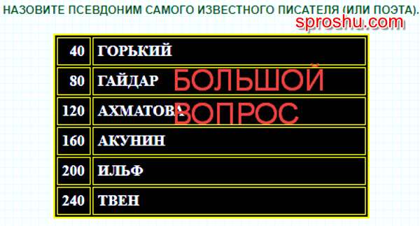 Горький - отгадаем писателя Пешкова на верхней строчке и набираем 40 очков;