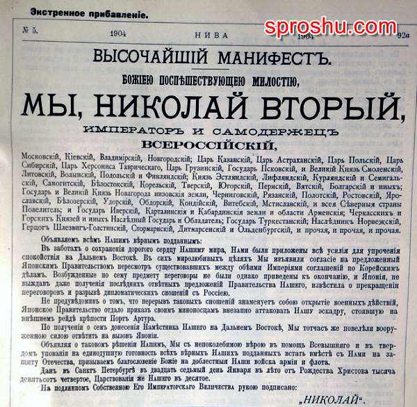 Судя по тому, что половина манифеста занимает только перечение титулов Николая второго, то правитель настолько сильно уважал себя и свои титул, что даже манифест писал не лично от себя, как человека, а как от величайшего правителя, от третьего лица, (объявляем, отправляем) с уважением к самому себе и обращался к народу исключительно Мы.