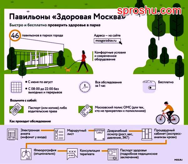 Сейчас уже открыты все павильоны в Москве, всего их 46, работают они очень удобно, начинаю с 8 утра и заканчивают в 22.00. Началась программа 3 июня и закончится 9 сентября. Чтобы воспользоваться бесплатным обследованием, надо иметь с собой паспорт и полис, если нет прикрпеления к поликлинике, прикрепят на месте.