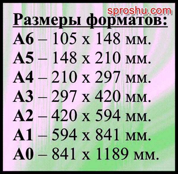 Соотношение сторон равно √2. Такое соотношение выбрано для удобства. Каждый меньший получается из большего простым делением пополам. Т.е. нужно перегнуть лист, сложив его ровно пополам и разрезать по сгибу. Ну, а сами размеры взяты из соображения, чтобы при заданном соотношении сторон (√2) размер листа формата А0 был ровно 1 м^2.