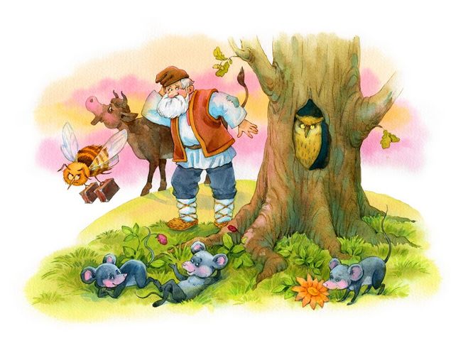 В сказке Виталия Бианки "Сова" речь идет о размолвке между Стариком и Совой. Как-то Старик нагрубил Сове, на что птица обиделась и отказалась ловить мышей. В результате на лугу разгулялись мыши, шмели разлетелись, а клевер не уродился. И только когда корова оголодала без корма и перестала давать молоко, Старик решил помириться с Совой.