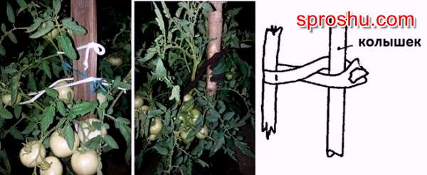 Нужно сказать, что помидоры сильно не боятся, если заденут их корни, это, скажем, например, не перец. Поэтому я вбиваю колышек сантиметрах в 7-10 от ствола. Если ближе, тогда можно повредить само растение. Если дальше, то ствол помидора получался у меня далеко, и если плодов было много, то некоторые стволы перегибались, да и подвязать к стволу было не очень удобно, если колышек далеко. Привязываю помидоры подвязками (верёвками, тесёмками, лентами из ткани) к стволу восьмёркой (смотрите ниже фото), так учила мама, меньше вероятности травмировать растение. Колья стараюсь вбить пораньше, пока растение ещё не слишком большое, и сразу поливаю.