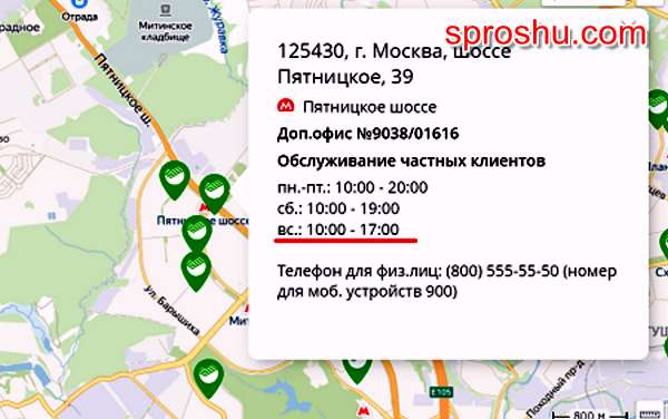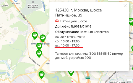 3) Опускаем курсор вниз и смотрим список. К сожалению, перечисленные там отделения могут работать в субботу и не работать в воскресенье. К счастью, их совсем не много (даже для Москвы). Поэтому придется нажимать на каждое из них и тогда появится подробный график работы, в котором будет указано, работает ли данное отделение по воскресеньям. Пример: