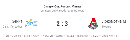 В субботу 6 июля матчем за Суперкубок России стартовал новый футбольный сезон. В Москве на стадионе "ВТБ Арена" встретились питерский Зенит и московский Локомотив. Команды уже не один раз владели этим трофеем и явно были не против выиграть этот кубок ещё раз. Счёт в матче уже на 6 минуте открыл Локомотив, гол на счету Фёдора Смолова. В дальнейшем шла равная игра и Зенит только на последних секундах первого тайма смог счёт сравнять. Гол забил Сердар Азмун и он же вывел Зенит вперёд во втором тайме. Локомотиву потребовалось почти полчаса чтобы сделать счёт равным. Алексей Миранчук классным ударом уравнял шансы команд, но уже через три минуту он же установил победный счёт. 3:2 - Локомотив обладатель Суперкубка России-2019.