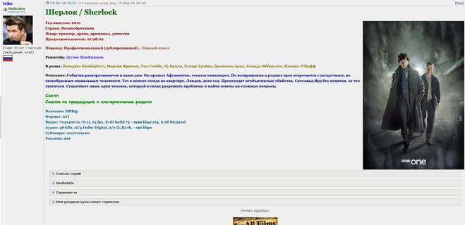 Я всегда скачиваю файлы с рутрекера. Роскомнадзор постарался и теперь на рутрекер не так просто попасть, по-крайне мере у меня даже с freegate не заходит. Спасает браузер Tor. На сегодняшний день выпущены 4 сезона, решается будет ли 5 сезон, но Камбербэтч подписал контракт на участие в пятом сезоне, премьера же якобы 2 января 2020 года.