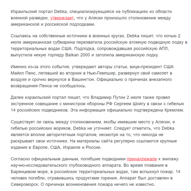 На Израильском сайте появилась информация о том, что произошло военное столкновение двух подводных лодогк у берегов Аляски: России и США. На настоящий момент известно немного. В основном СМИ сообщают следующую информацию: