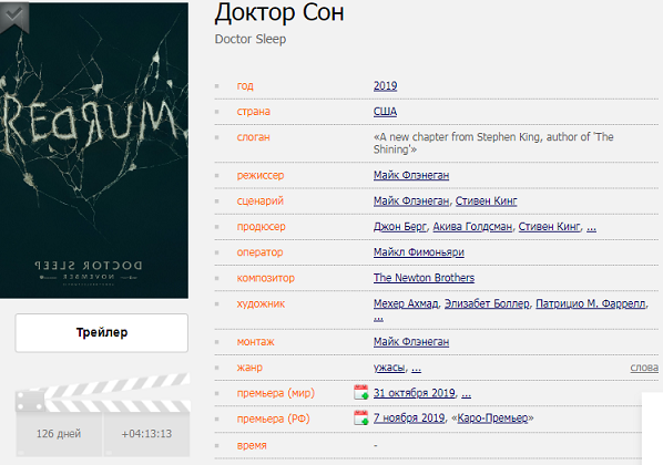 "Доктор Сон" - американская киноновинка, которая еще не вышла на экраны кинотеатров, но уже ожидается любителями кино (а в данном случае, любителями ужасов). Режиссер Майк Флэнеган. Это будет осенняя премьера, как мировая (31 октября 2019 года), так и российская (седьмого ноября этого года). Как долго еще до премьеры, а рейтинг ожидания уже высочайший - 98 процентов на сегодняшний день. Много в мире все-таки любителей ужастиков!