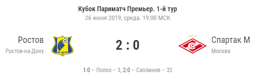В среду 26 июня в Австрии стартовал предсезонный турнир Кубок Париматч Премьер с участием четырёх российских клубов. В первой игре Кубка встретились Ростов и Спартак. Первый тайм получился не очень интересным, в первую очередь из-за игры Спартака, точнее из-за её отсутствия. Ростовчане смотрелись лучше и смогли реализовать два момента. Уже на 3 минуте отличился Дмитрий Полоз, находящийся сейчас на просмотре в Ростове, а молодой Александр Саплинов забил второй гол после прохода Попова. Во втором тайме команды постепенно сменили составы. Состав Спартака стал более приближен к основному и это дало свои плоды. Красно-белое создали несколько опасных моментов, но реализовать их не смогли. Матч так и завершился со счётом 2:0 в пользу Ростова.