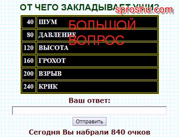 Шум - от шума закладывает уши, такой ответ откроем на верхней строчке и заработаем за шум 40 очков;