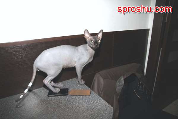 Это лысая порода кошек,она называется канадский сфинкс. (По мне, так ужас, какой страшный.) Зовут Чуча. Как известно, котика уже вернули, правда, как жалуется Бари Алибасов, тот его не очень-то узнает. Наверное, после пережитого стресса.