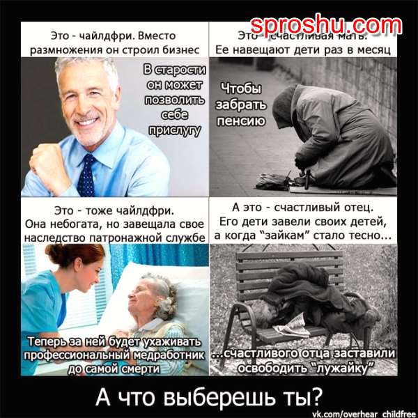 Когда смотришь на отношение взрослых детей к родителям, то часто понимаешь этих чайлдфри. Конечно, все понимают, что детей воспитали как раз эти родители, что все недостатки детей - это результат воспитания родителей. Но все равно жалко этих родителей. Недавно беседовала с бездетной подругой (в возрасте) об одной нашей знакомой и ее взрослых детях. Она сказала, что нисколько не жалеет об отсутствии у нее потомства. Конечно, молодость ее уже прошла, но есть муж, есть работа, есть разные увлечения. Любит своих племянников и племянниц, обожает их детей. Так что есть кому завещать квартиру, найдется также кому в случае чего посидеть у ее кровати.