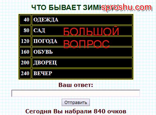 Сейчас не зима, по этому для ответа нужно немного напрячь свою голову. Первое что вспомнилось по поводу зимы, это погода. Зимняя погода определяет все любые последующие ответы. Зимняя одежда отличается от любой другой как по гардеробу так и по качеству. Сюда можно добавить зимнюю обувь. И еще вспоминаются слова в песне - зимний вечер. Игроки назвали такие ответы :