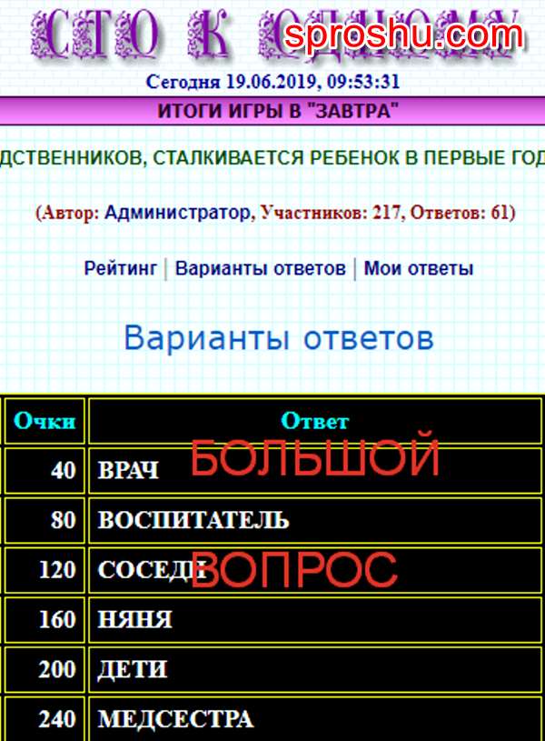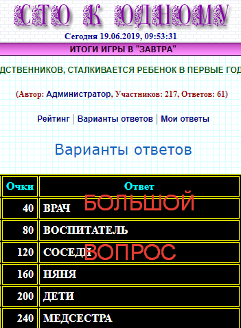 Дети - отгадаем на пятом месте и выигрыш за детей составит 200 очков;