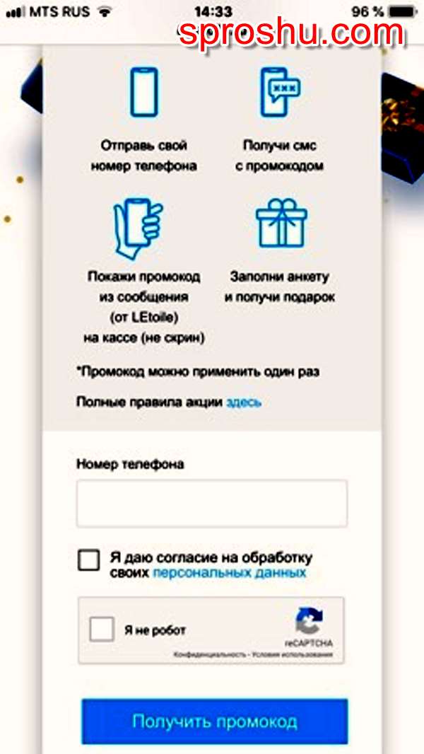 Для начала нужно на данной странице оставить свой номер телефона, после в виде СМС придет промокод.