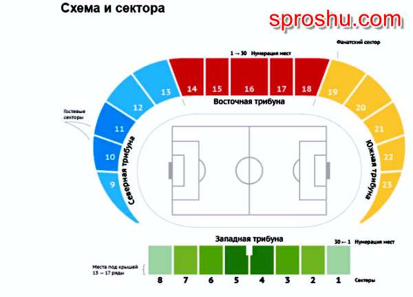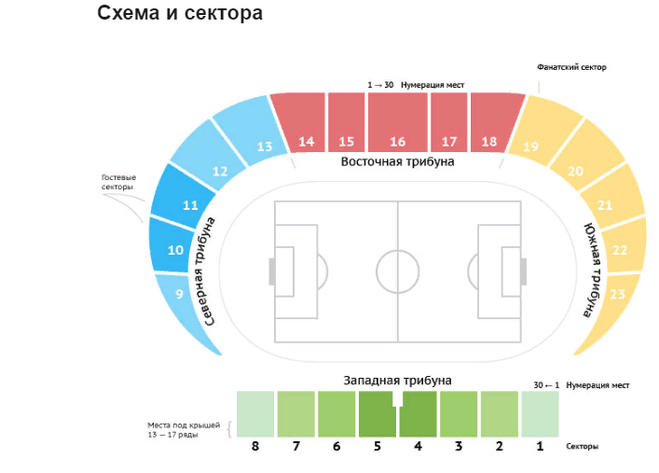 Гостевые сектора, это с 9 по 13, располагаются на Северной трибуне, а для фанатов предоставляется полностью Южная трибуна .