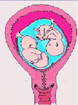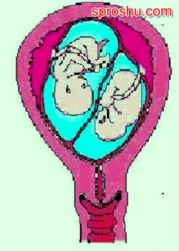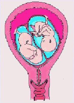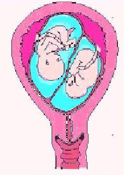 Другой вариант -- когда оба плода находятся внутри одного общего мешка, амниотического и хориального, имеют общую плаценту такая двойня называется моноамниотическая (и, соответственно, монохориальная) двойня: