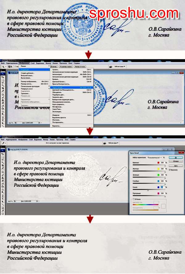 Как проще с помощью фотошопа убрать из документа цветные печати и подписи?
