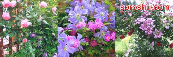 Хорошо смотрятся мелкие розочки с небольшими цветками клематиса, а возле плетистых роз уместно высадить клематисы с крупными цветками.