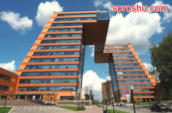 Новосибирск. Это здание называется Академпарком и располагается в Академгородке. Очень интересная форма: дома построены в виде наклонённых многоэтажных башен,которые на уровне тринадцатого этажа соединены галереей, позволяющей переходить из одной башни в другую. Башни как бы обступают улицу Николаева, образуя при этом своеобразную арку. К ним пристроены здания административного назначения, в которых размещается всё, что нужно для технологического и сервисного обслуживания Академпарка.