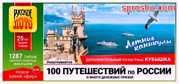 Опять наступило воскресенье и , значит, многие с волнением следили, какие же бочонки принесут выигрыш в 1287 тираже "Русского лото". В розыгрыше участвовало 100 путешествий по России, много денежных призов, джекпот, и специальный дополнительный розыгрыш "Кубышка". Игра шла до 86 хода. В мешке остались 4 бочонка со следующими номерами :64,70,75 и 87. По условиям лотереи, если этих номеров нет в вашем билете, значит вы выиграли.