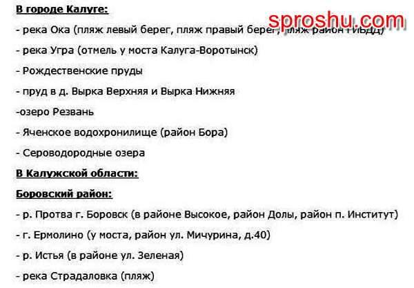 На сайте Роспотребнадзора опубликован список мест для купания в Калуге и Калужской области где нельзя купаться и где можно. Привожу его полностью (источник):