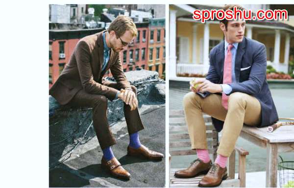Вопрос длины носок больше актуален для делового и торжественного стиля. Под брюки , желательно свой выбор сделать в пользу тех, которые не позволят видеться «голой» ноге при сгибе в колене.