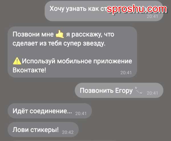 В выпадающем меню выбираем пункт "Позвонить Егору Криду" и после соединения появится короткий ролик, в котором Егор Крид поделится секретом успеха. После этого будет выдана четвёртая часть стикеров, а робот предложит выполнить пятое задание.