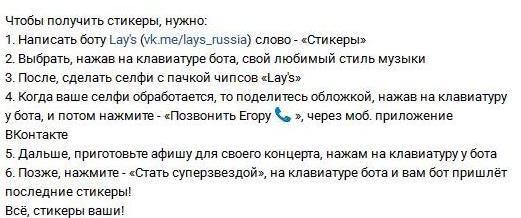 Самое забавное задание для получения стикеров с Егором Кридом - это выслать селфи с пачкой Lay’s. Если тратить время и деньги на приобретение Лэйс и селфи не хочется, то рекомендую заглянуть сюда.