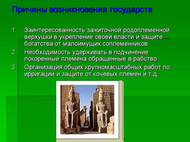 Древнейшие государства появились около пяти тысячелетий назад в долинах крупных рек Нила, Тигра, Евфрата, Инда, Ганга и некоторых китайских водных артерий. Эти государства получили общее название государства Древнего Востока.
