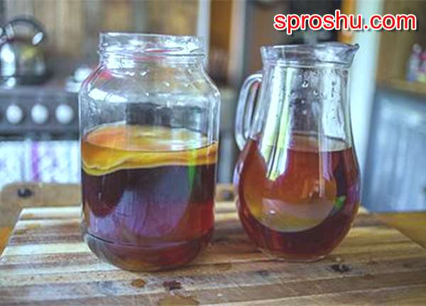 Для начала заварим чай. В один литр кипятка всыпем две маленьких ложки среднелистового чая и дадим настояться примерно 15 минут. Через 15 минут процедим, всыпем три больших ложки сахарного песка, перемешаем и дадим остыть до комнатной температуры. Остывший чай перельём в трёхлитровую банку, накроем несколькими слоями марли, стянем по ободочку банки резинкой и у берём в тёмное и тёплое помещение. Примерно через четыре дня на поверхности жидкости появится масляная плёнка, будущая комбучу. Примерно через пять недель комбучу вырастет. Всё очень просто и понятно. Приятного аппетита!