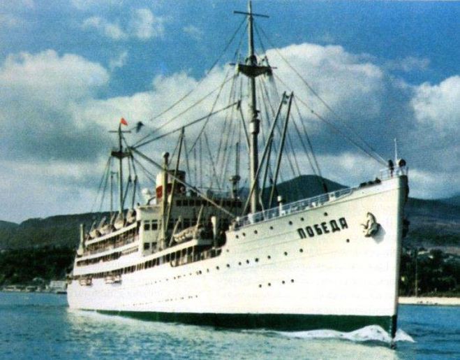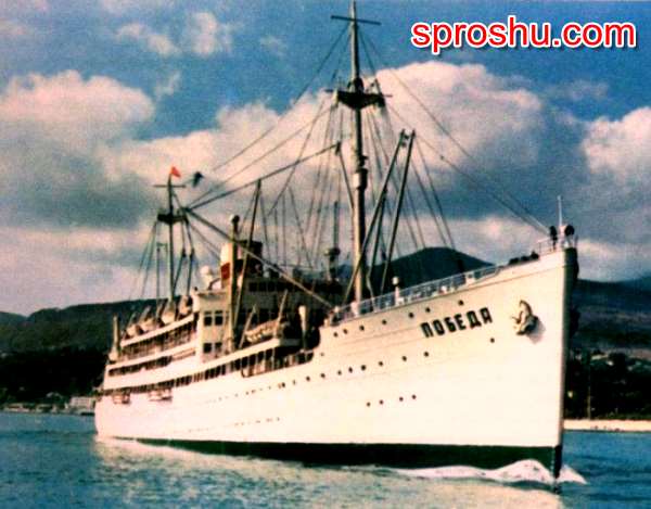 Что касается конкретных примеров, то бывший немецкий круизный лайнер "Иберия", построенный в 1928 году в Данциге, получил в СССР новое имя "Победа", до 1980-х работал на Чёрном море и даже отметился в "Бриллиантовой руке" как "Михаил Светлов", именно на его палубе пел Андрей Миронов про Остров невезения. Что интересно, "Победа" еще под немецким флагом села на мель вблизи карибского острова Кюрасао, известного своим синим ликёром, так что история про тропический остров невезения, возможно, была навеяна тем эпизодом.