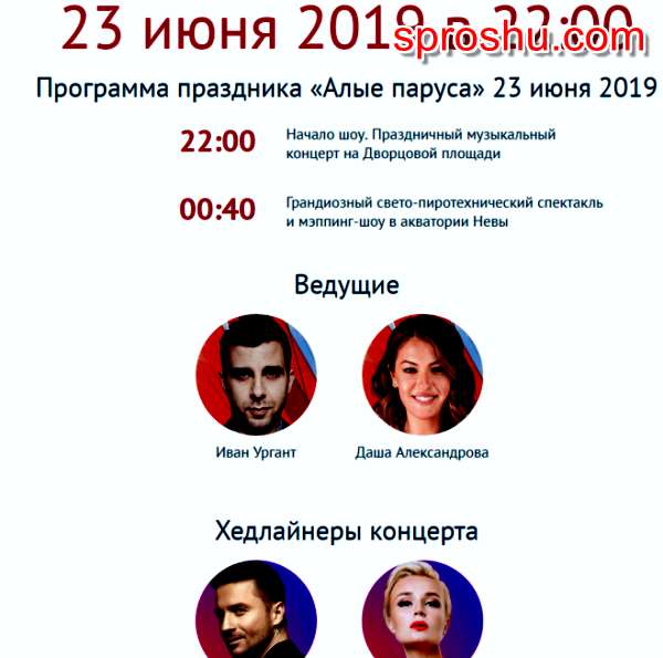 Прямая телевизионная трансляция праздника Алые паруса состоитья 23 июня в 22.00 часа, на Пятом канале. Будет очень много знаменитых артистов певцов и певиц. Многие звёзды приедут в этот день в город Петербург чтобы выступить на данном празднике будет очень весело и интересно