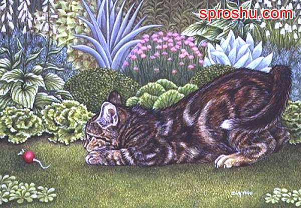 На заднем плане картины очень четко и ярко нарисовал живописец цветы и травы. Из представителей растительного мира здесь можно увидеть: хосту, ландыши и колокольчики. На фоне травы нарисован кот, который присел перед прыжком на передние лапы. Молодой охотник увидел перед собой сорванную и уроненную кем-то редиску и решил поиграть, поохотиться на нее. Вероятно, кот молодой и игривый. Окраска у кота яркая, тигровая, коричнево черных тонов. Только кончик хвоста и ушки - белой окраски.