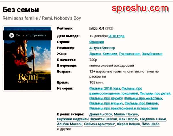 Если посмотреть на рейтинг фильма, то можно увидеть, что он вполне достойный. Так, по версии зарубежного интернет киноресурса IMDb фильм "Без семьи" на сегодняшний день набрал 6.8 балла из 10 возможных.